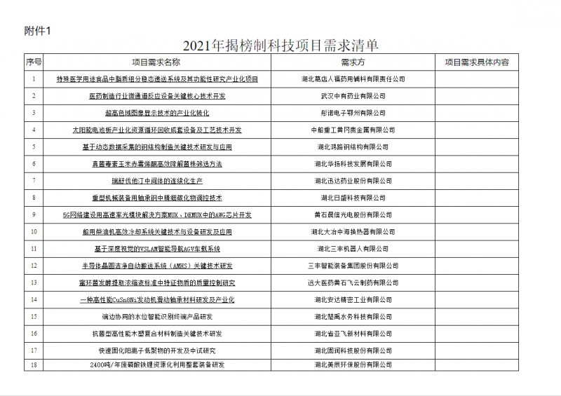 科技項目揭榜制是科研項目組織方式的創(chuàng)新機制,旨在組織引導(dǎo)省內(nèi)外優(yōu)勢科研力量,聚焦我省光芯屏端網(wǎng)、先進制造、生物醫(yī)藥等重點產(chǎn)業(yè),攻克產(chǎn)業(yè)“卡脖子”瓶頸,加快取得一批創(chuàng)新性強、應(yīng)用效果好的標(biāo)志性技術(shù)、產(chǎn)品和服務(wù)。按照《湖北省科技項目揭榜制工作實施方案》安排,經(jīng)形式審查和專家評審,省科技廳共遴選出100個揭榜制科技項目需求(見附件1)予以發(fā)布。現(xiàn)就做好揭榜工作有關(guān)事項通知如下: